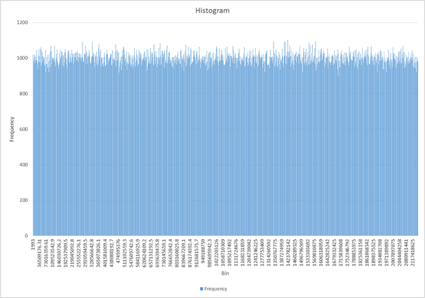 The MT generator prooduces a uniform distribution of random numbers. To test that claim, I produced a histogram of the 1 million numbers generated by the test. The chart below shows the distribution of the generated numbers. Visually, the sequence appears uniform.